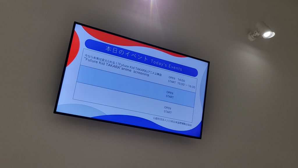 スクリーンが下りてきて、5分ぐらいのアニメを2本連続上映。