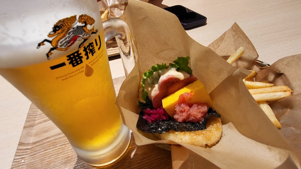 〆のライスバーガーと4ビール目の日本2,100円ぐびー!