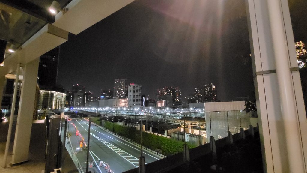 ホテルへの帰り道、高輪ゲートウェイ駅から見えた夜景。